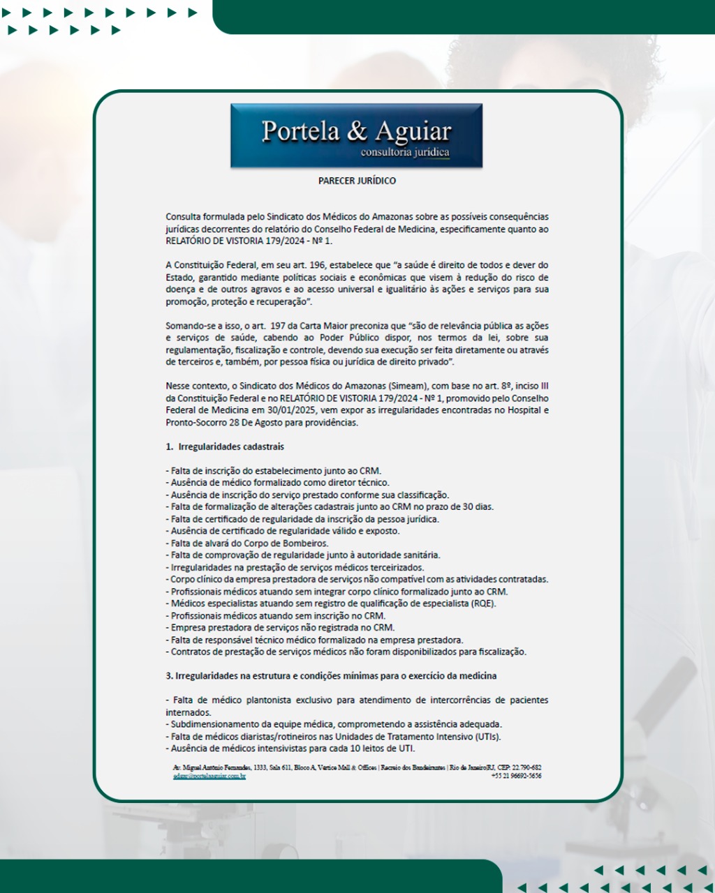 Com base no relatório de vistoria do CFM, os advogados do Simeam representados pelo Dr. Edgar Portela, chefe do setor jurídico do Simeam emitiram o parecer destacando as não conformidades graves apontadas pelo CFM. Irregularidades essas que segundo o presidente do Simeam exigem uma providência mais severa dos órgãos fiscalizadores “Os pontos levantados pelo Conselho, ressaltam o que estamos apontando há meses, desde o início dessa gestão da Agir a frente do 28 de Agosto. É inadmissível que os órgãos fiscalizadores fechem os olhos para essas inconformidades graves. Precisamos levar esse relatório para instâncias maiores e até mesmo pedir interdição ou intervenção na saúde pública do Amazonas. Não é possível que seja preciso vir uma outra pandemia para que as pessoas entendam o caos que a saúde pública do Amazonas está vivenciando” afirmou Vianna.